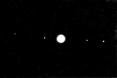 Bild 19: Jupiter mit seinen großen Monden. Okularprojektion mit einem 26 mm-Okular. Aufnahme im Januar 1989 auf Kodak E 400.