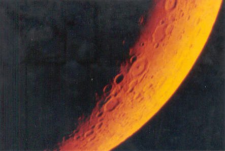 Bild 9: 26 mm-SP-Projektion im Frühjahr 1989 mittels Orangefilter. In der Mitte des Terminators erkennbar: Der Krater Petavius mit seinem Zentralberg. Kodak E 400.